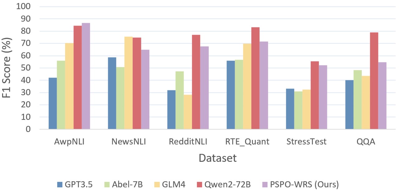 We conducted a comparative analysis of PSPO-WRS against mainstream ultra LLMs, as detailed in Figure 5. Across all evaluated datasets, the PSPO-WRS significantly outperformed GPT-3.5, relative to GLM4 , our model showed slightly weaker performance on the NewsNLI dataset but exhibited superior performance on other datasets. Against the more robust reasoning capabilities of Qwen2-72B , PSPO-WRS also showed its strengths in the AwpNLI dataset and demonstrated comparable performance on additional datasets.